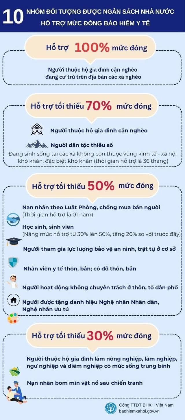 Luật BHYT năm 2024 và Nghị định số 188/2025/NĐ-CP của Chính phủ quy định 10 nhóm đối tượng được ngân sách nhà nước hỗ trợ mức đóng, trong đó bổ sung thêm 4 nhóm đối tượng mới. Đây là sự khẳng định rõ nét về quan điểm, chủ trương của Đảng, Nhà nước trong việc bảo đảm an sinh xã hội cho nhóm yếu thế và nhóm có đóng góp đặc thù cho xã hội.