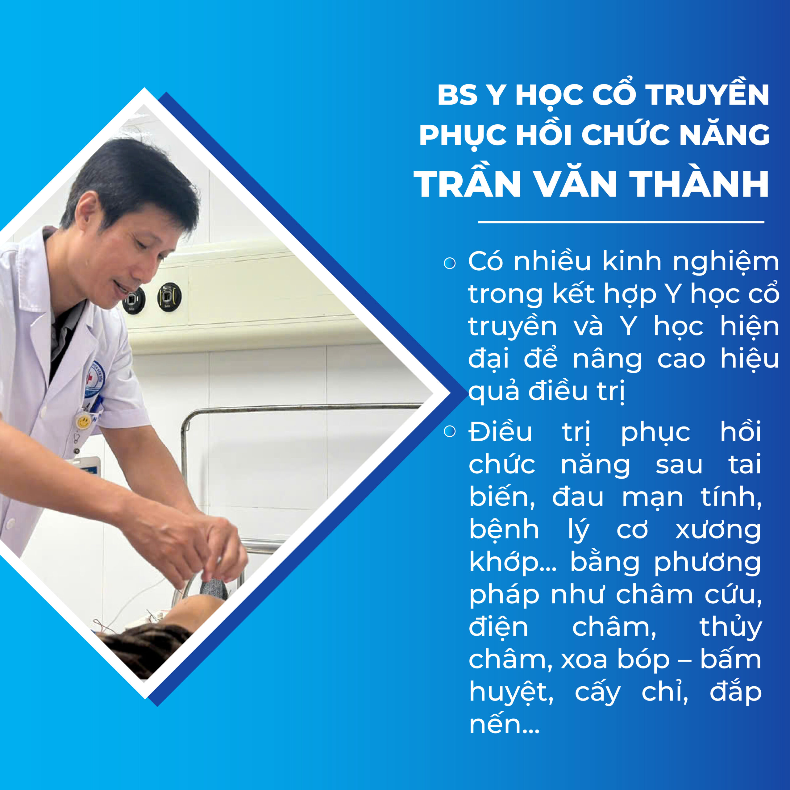 BS Trần Văn Thành được đào tạo bài bản về Y học cổ truyền, có kinh nghiệm trong thăm khám, chẩn đoán và điều trị các bệnh lý theo phương pháp y học cổ truyền kết hợp phục hồi chức năng. Bác sĩ thực hiện thành thạo các kỹ thuật điều trị không dùng thuốc như châm cứu, điện châm, thủy châm, xoa bóp – bấm huyệt, cấy chỉ cùng các phương pháp điều trị hỗ trợ phục hồi chức năng sau tai biến mạch máu não, tổn thương thần kinh và bệnh lý cơ xương khớp.