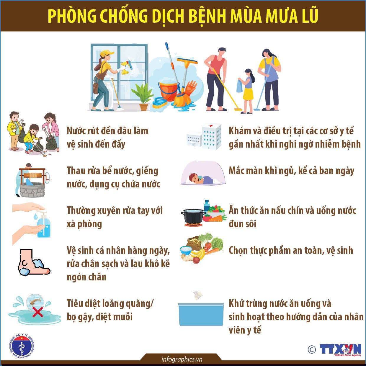 Sau mưa lớn và ngập lụt kéo dài, nguy cơ bùng phát các bệnh truyền nhiễm luôn hiện hữu do môi trường ô nhiễm, nguồn nước sinh hoạt bị nhiễm bẩn, thực phẩm dễ hư hỏng và điều kiện vệ sinh kém. Nhằm chủ động phòng bệnh, bảo vệ sức khỏe nhân dân, Bộ Y tế đã ban hành hướng dẫn chi tiết về cách xử lý nước, vệ sinh môi trường, thu gom rác thải và các biện pháp dự phòng sau lũ.