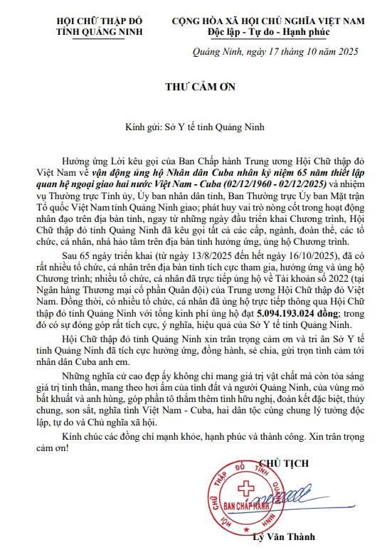 Hưởng ứng Lời kêu gọi của Ban Chấp hành Trung ương Hội Chữ thập đỏ Việt Nam về vận động ủng hộ nhân dân Cuba nhân dịp kỷ niệm 65 năm thiết lập quan hệ ngoại giao Việt Nam – Cuba (02/12/1960 – 02/12/2025), Ngành Y tế Quảng Ninh đã tích cực tham gia chương trình, thể hiện nghĩa cử cao đẹp, tinh thần đoàn kết quốc tế và truyền thống nhân ái của người thầy thuốc Việt Nam.