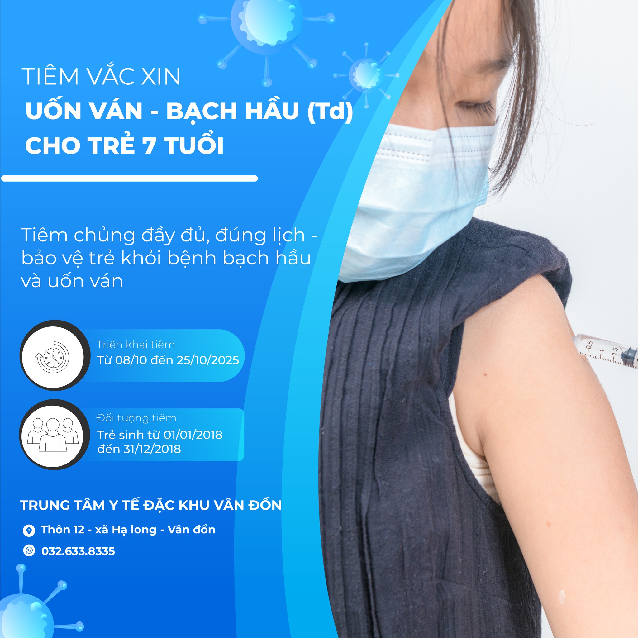 Tiêm chủng mở rộng là biện pháp hiệu quả, an toàn giúp bảo vệ trẻ em trước các bệnh truyền nhiễm nguy hiểm. Trong đó, tiêm vắc xin uốn ván – bạch hầu (Td) cho trẻ 7 tuổi là một mũi tiêm quan trọng, giúp tăng cường miễn dịch và duy trì sự bảo vệ lâu dài.